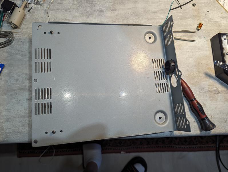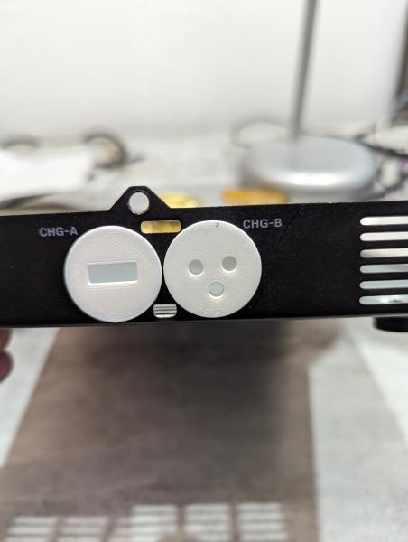 on commence par enlever les deux bouchons à l'arrière du poste (CH1 et CH2). J'ai dessiné deux nouveaux bouchons. le premier pour accueillir l'interface USB et le second un simple passage de câble. Les deux trous libres sont réservés pour une prochaine modification