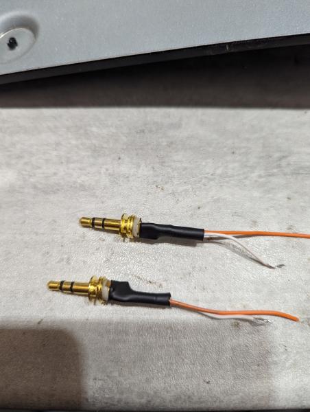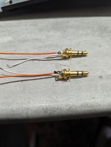 Préparation des prises jack 3.5mm trouvées chez le même fournisseur. Je ne me sert que de l'extémité et de la masse. J'ai donc coupé la connexion de la broche qui ne sert à rien. Ne mettez pas les deux cannaux en // . Ca ne sert à rien et le niveau audio sera plus bas ! Bien entendu, il faut tout isoler avec de la gaine rétractable. Il NE FAUT PAS QUE LE CHASSIS DE LA PRISE USB TOUCHE LE CHASSIS DU POSTE !!! |