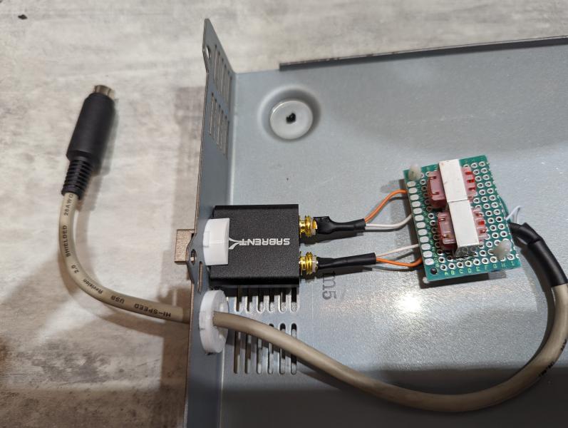 | j'ai monté les deux transfos sur un bout de plaquette à pastilles, soudé les deux prises jack qui iront se connecter à l'adaptateur audio et soudé les trois fils qui iront sur une fiche mini-Din 6 broches qu'on branchera à la prise DATA du poste. Je vous laisse le soin de vérifier le brochage de la prise de votre TRX |
